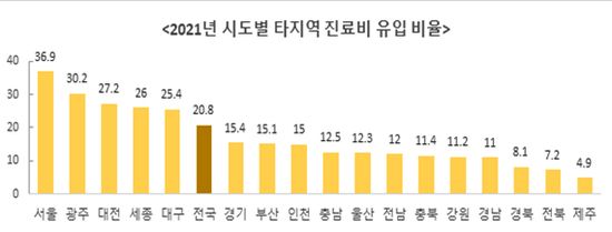 2021년 전체 진료비 105조 2,248억 원 중 요양기관이 소재하고 있는 시‧도를 기준으로 타 지역에서 유입된 환자의 진료비 비율이 20.8%(21조 8,559억 원)를 차지했다.