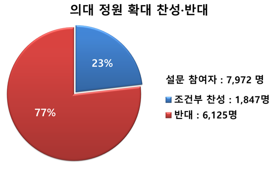 조사 결과를 보면 의료계와 합의 된 필수의료 대책 등이 선결 된 이후의 의대 정원 확대라는 조건을 달았음에도 불구하고 설문에 참여한 회원의 77%는 의대 정원 확대 자체를 반대하는 것으로 나타났다.