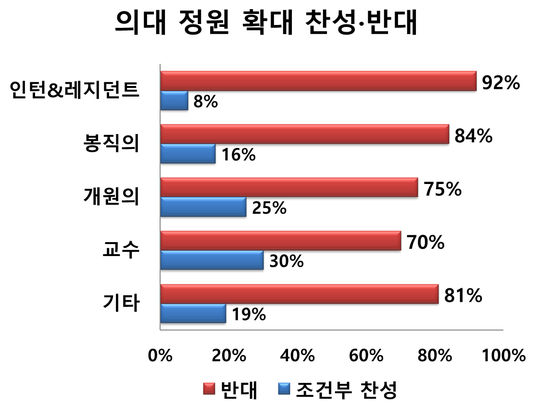 직역별로 살펴보면 인턴·레지던트 등 전공의들은 의대정원 확대에 92%가 반대했다. 봉직의는 84%, 개원의는 75%, 교수 70% 순으로 반대 답변이 많았다.