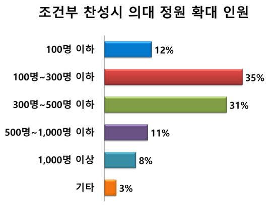 의대 정원 확대를 조건부로 찬성할 경우 얼마나 증원을 해야하는지 묻는 질문에 ‘100명 ~ 300명 이하’가 35%가 가장 많았다. 이어 ‘300명 ~ 500명 이하’가 31%, '100명 이하' 12%, '500명~1000명 이하' 11%, '1000명 이상' 8%, '기타' 3% 순이었다.